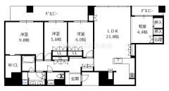 パークタワー北浜(大阪市 中央区北浜東)にある4LDK(洋9.8 洋6.0 洋5.6 和4.4 LDK21.8)のお部屋です。