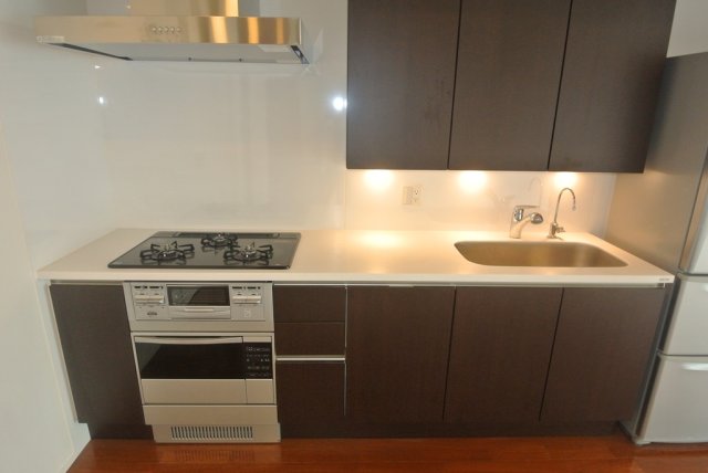 - 【Living room・Entrance・Interior】 / Dimple key, monitor-equipped intercom, air conditioning, flooring, floor heating (living dining only), blinds, downlights, high-speed internet, LAN wiring, soundproof walls, double glazing (only in units on the west side), balcony / 【Kitchen】 / System kitchen, dishwasher, built-in oven range, refrigerator, garbage disposer, gas stove (2 or more burners) / 【Sanitary】 / Toilet with warm water bidet, gas water heater, wash basin, laundry pan / 【Bathroom】 / Automatic water heating (reheatabl