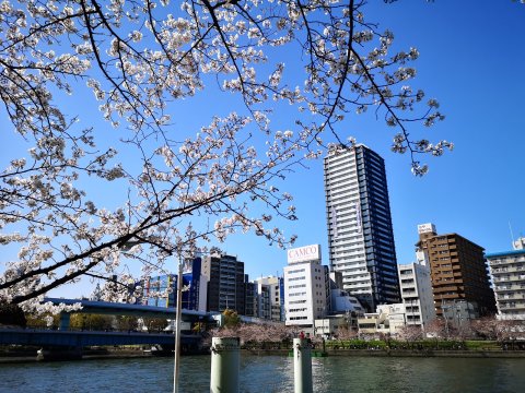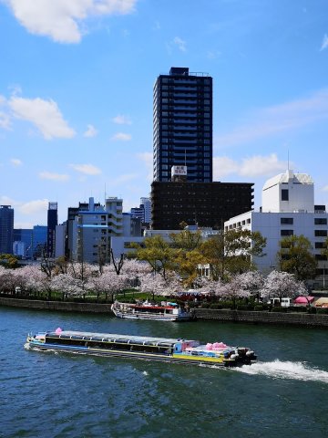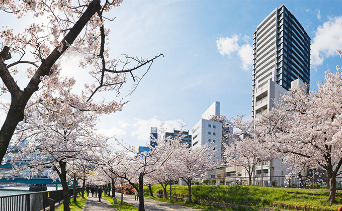 Sparkle of the Okawa River flowing gently, cherishing the heart with cherry blossoms and greenery, various traditional events such as Tenjin Festival